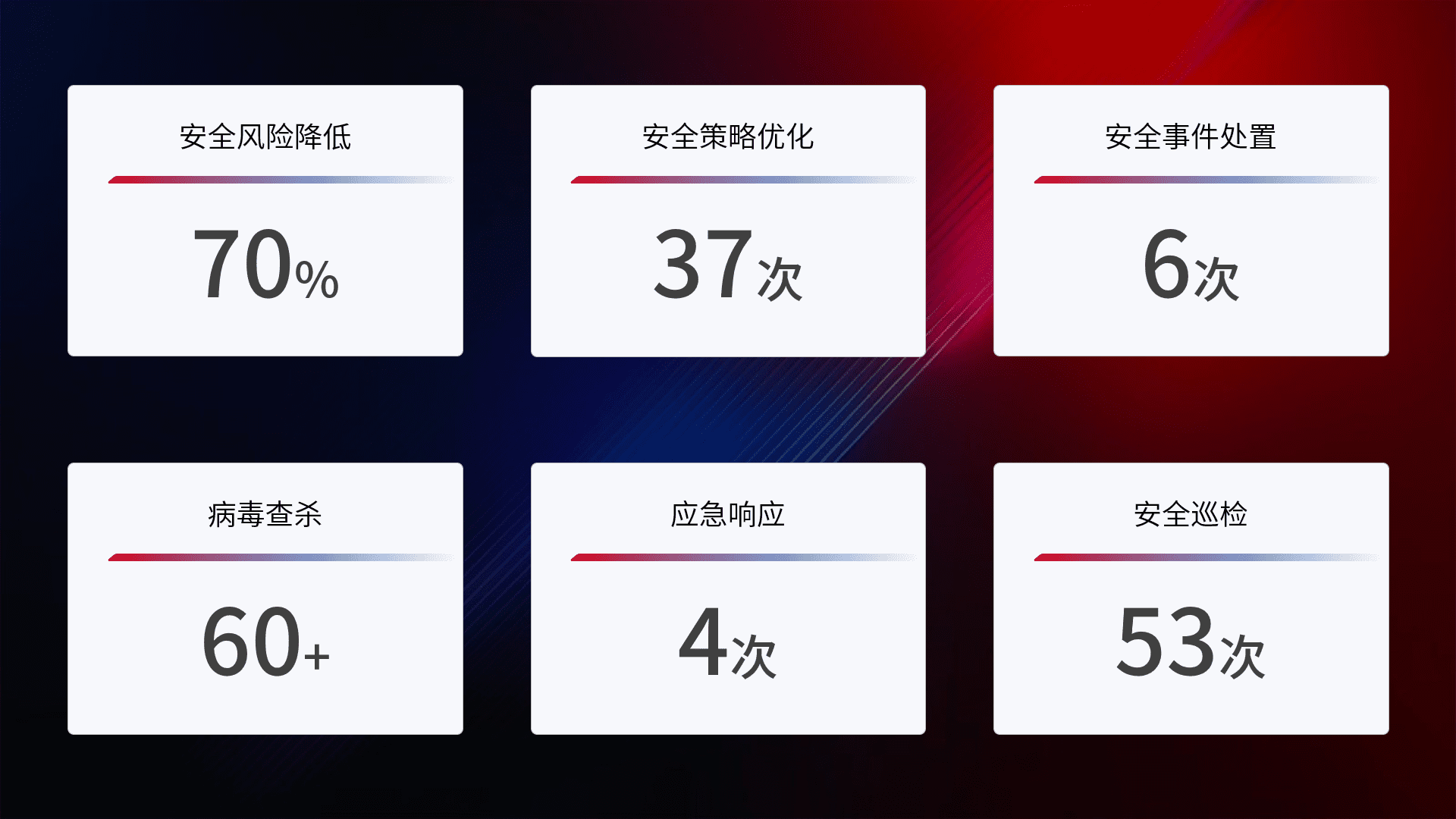 提供全面的安全事件报告体系,,包括处置报告、、周报、、、季度和年度总结,,,结合持续监控,,,,帮助客户深入了解网络安全状况。。