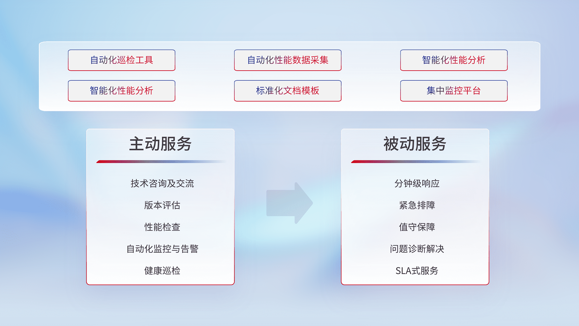 智能化工具和标准化文档,,,,保障服务质量,,提供主动服务(包含技术咨询、、、版本评估、、性能检查、、自动化监控与告警、、、健康巡检)和被动服务包含(分钟级响应、、紧急排障、、、、值守保障、、问题诊断解决、、、、SLA服务)。。。。