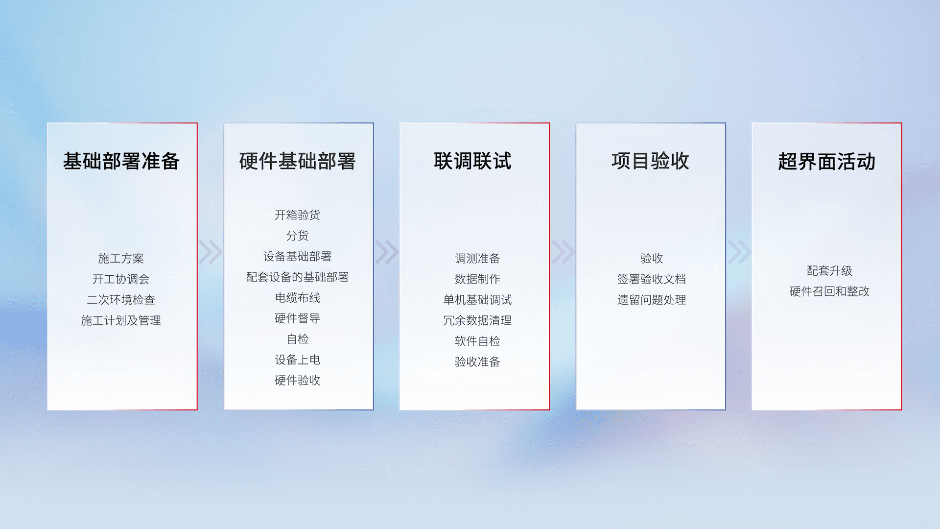 从基础部署准备、、硬件基础部署、、、、联调联试、、、、项目验收、、、越界面活动的全过程可追溯,,保证施工质量和进度。。。